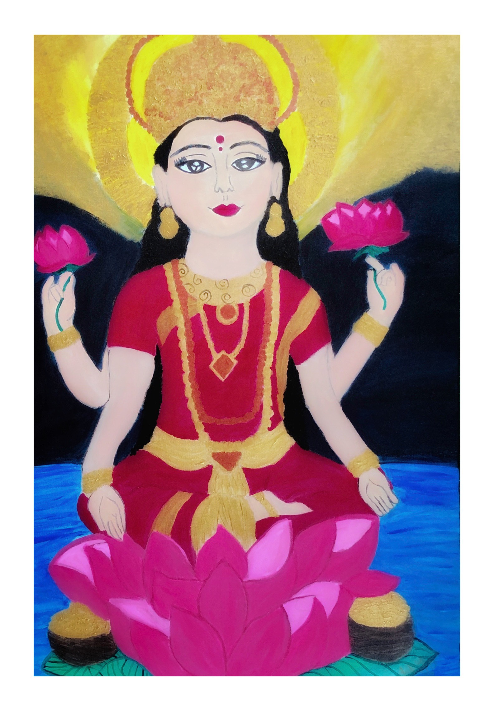 Lakshmi is known as the Goddess of wealth, health, prosperity, both material and spiritual, light, wisdom, fortune, fertility, generosity and courage. She is also the embodiment of Shakti; feminine energy.